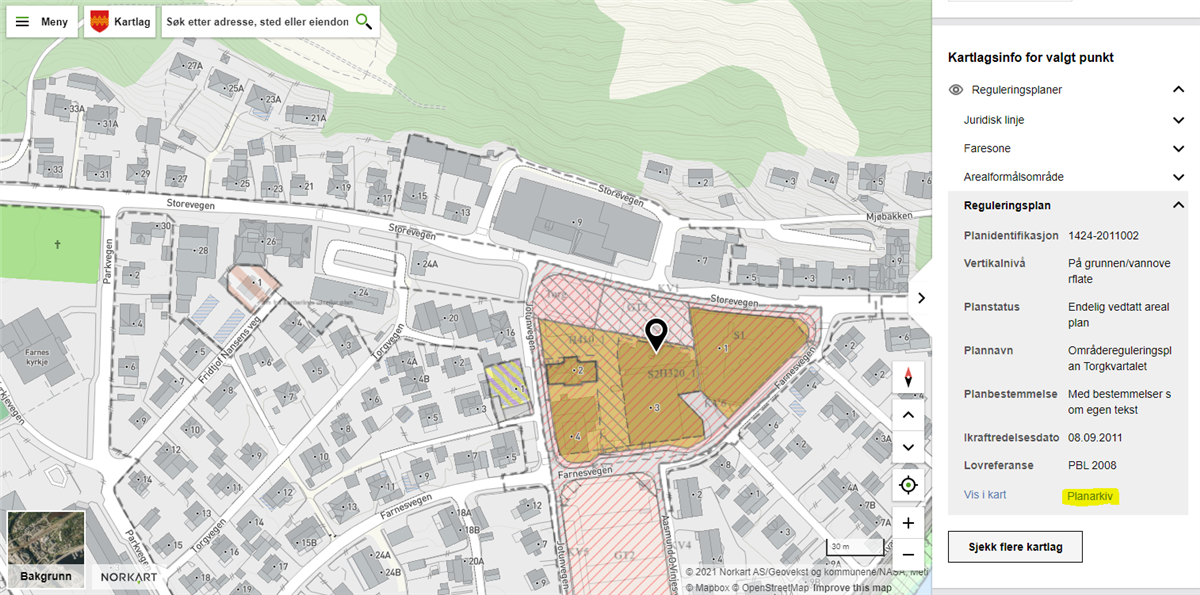 Zoom inn på Årdal eller skriv inn adresse, trykk på "Kartlag" i øvre venstre hjørnet, merk av "reguleringsplanar" i menyen som kjem opp på høgre side. Marker i kartet, og vel «Planarkiv» som vist i bilete under:
